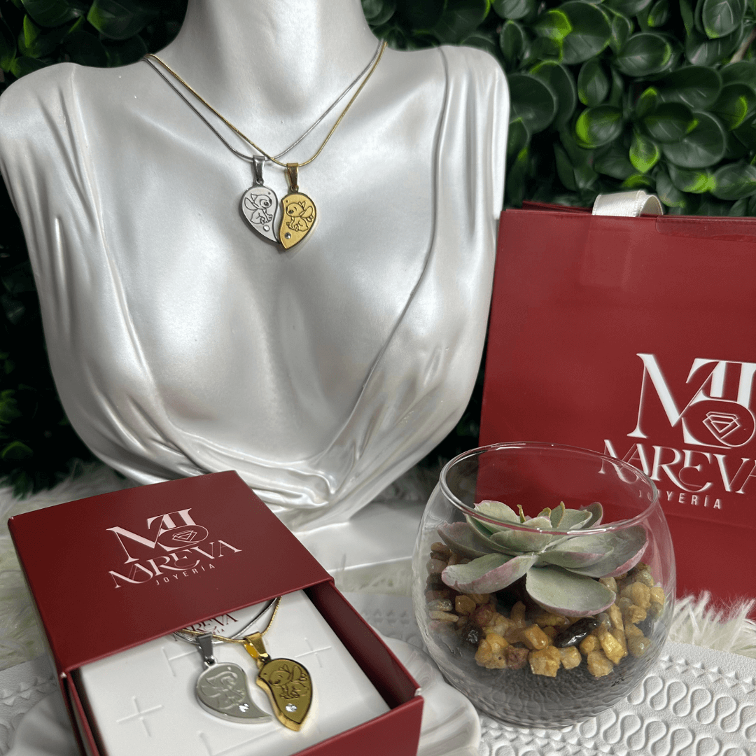 Este collar esta hecho a mano, cada pieza está cuidadosamente elaborada a la perfección, su acabado en dorado y plateado con piedra Circón tiene un diseño atemporal, realza un amor tan auténtico como el de Lilo & Stitch.